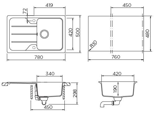 | Размер мойки | 780 х 500 |